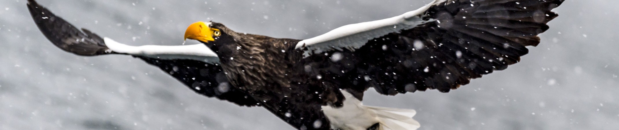 Steller’s Sea Eagles are among the rarest raptors in the world due to their remote habitat. They are impressive in appearance, with a dark colored body, white tail and striking yellow bill.